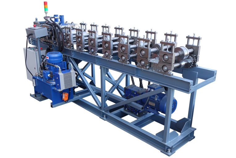 Станок оснащен штампом-гильотиной для вырубки пазов и пробивки отверстий и штамп-гильотиной для вырубки паза и отрезки до профилирования. На выходе из станка получается готовый профиль с предварительно вырубленными углами и пробитыми отверстями. Размеры профиля, кол-во профилей задаются на панели оператора системы автоматического управления. Готовые профиля по длине получаются с точностью +- 1 мм.